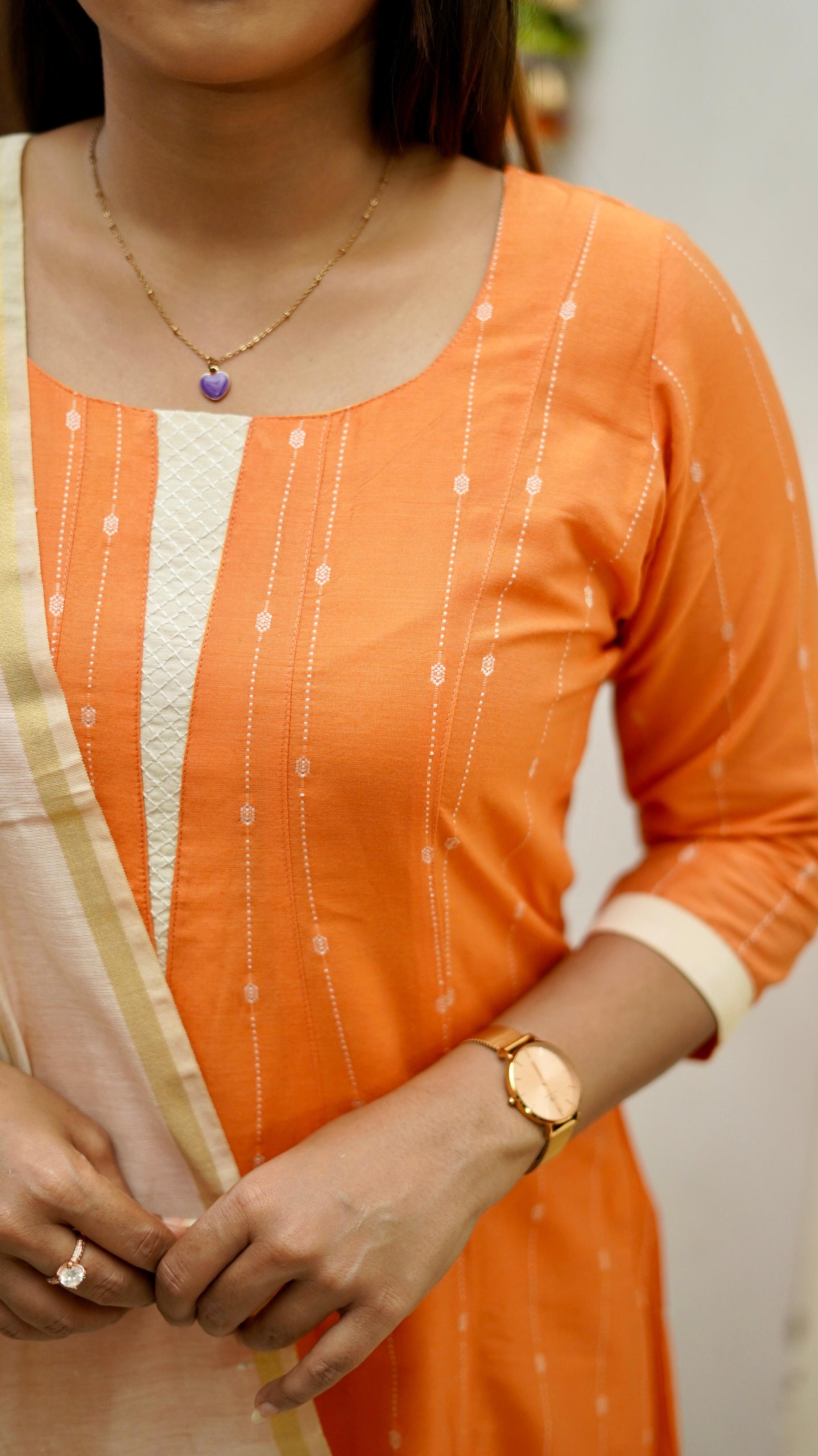 Brighten your look with this raw silk set featuring subtle woven lines and a soft off-white dupatta with yellow borders. Elegant, comfortable, and perfect for festive or workwear styling.
